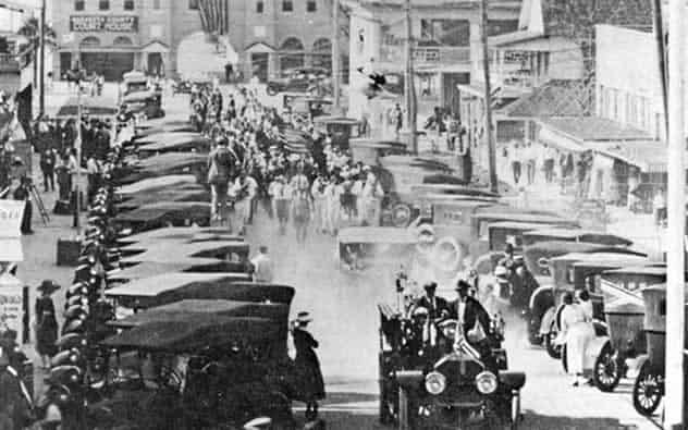 Sarasotans turned out en masse to celebrate the split from Manatee County in 1921. Here, the parade leaves the temporary court house in the Hover Arcade and proceeds up lower Main Street – horns blaring and sirens wailing.
